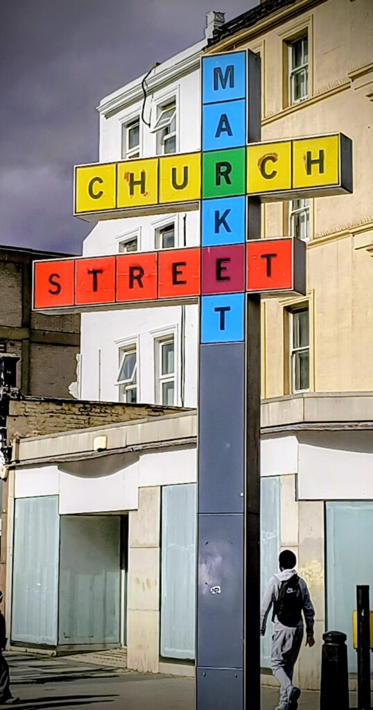 The landmark Church Street Market sign welcomes visitors to this busy, vibrant, multicultural market. The giant childlike alphabet blocks centred on the letter ‘R’ are arranged like the answer to a crossword puzzle.